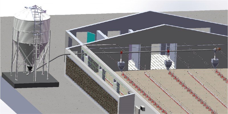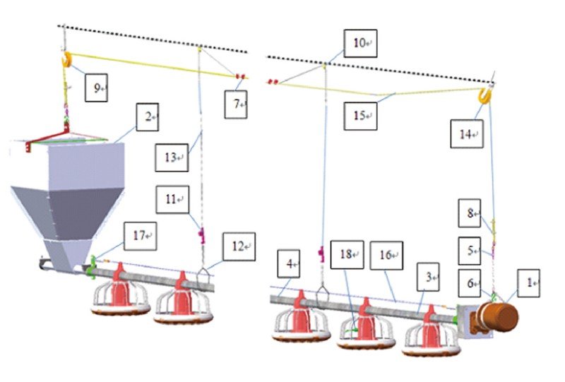 ● 通过螺旋弹簧绞龙旋转送料。料塔→鸡舍内喂料线。在主料线的末端有一料位感应器,自动控制驱动电机的 启闭,达到自动送料之目的。