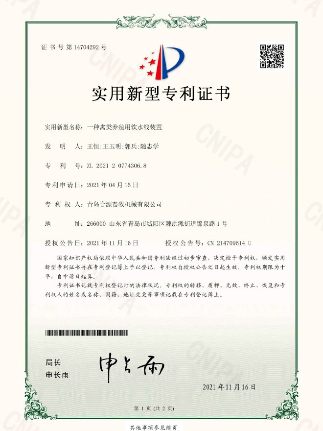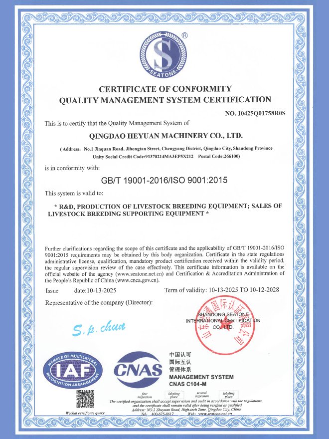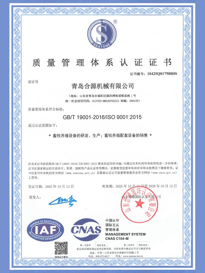 青岛合源机械有限公司主要从事研发、制造、销售肉鸡平养、肉鸡笼养、蛋鸡笼养、 肉鸭笼养、养猪、养鸽等自动化畜禽养殖设备;产品包括通风调温、自动输料、自动饮水、自动出鸡、自动集蛋、自动清粪、集中控制等;可为客户提供技术咨询、规划设计、环控方案、设备方案、安装调试、服务支持等全流程服务。我们以严格的质量保证体系和质量检测标准,为客户提供一流的自动化养殖设备,让养殖更简单、高效。